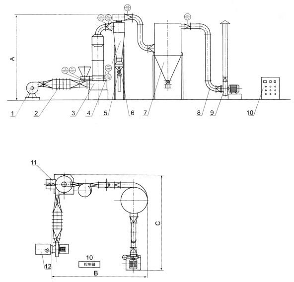 7. sac en plumeau 8. système de tuyau 9. ventilateur 10.cabinet de contr?le 11. chargeur 12. filtre à air |