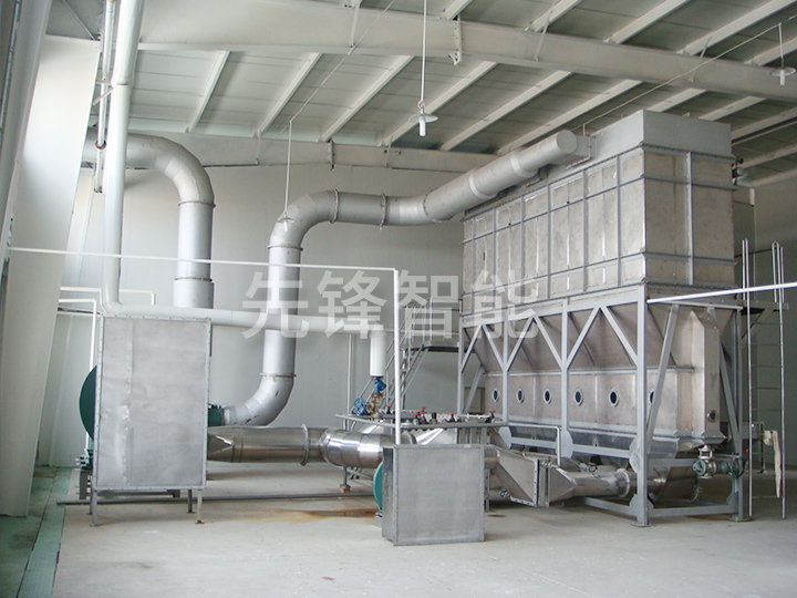 散粒狀固體物料由加料器加入流化床干燥器中,過(guò)濾后的潔凈空氣加熱后由鼓風(fēng)機(jī)送入流化床底部經(jīng)分布板與固體物料接觸,形成流態(tài)化達(dá)到氣固的熱質(zhì)交換。物料干燥后由排料口排出,廢氣由沸騰床頂部排出經(jīng)旋風(fēng)除塵器組和布袋除塵器回收固體粉料后排空。