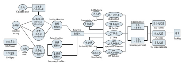 ★ 小型(時產(chǎn)200Kg)雞精生產(chǎn)線: 設(shè)備組成:30B粉碎機(jī)、CH-200槽型混合機(jī)、ZL-300B旋轉(zhuǎn)制粒機(jī)、ZLG-4.5×0.45振動流化床干燥機(jī)、FSO.6×1.5方型振動篩等。 特點:產(chǎn)能小而靈活,安裝運輸方便,設(shè)備投資較少,適合于個體用戶。為幫助個體用戶更快更熟練使用掌握生產(chǎn)線的技術(shù),我公司會對用戶進(jìn)行相關(guān)的技術(shù)培訓(xùn),并盡可能提供相關(guān)技術(shù)支持,甚至包括物料配比方案。